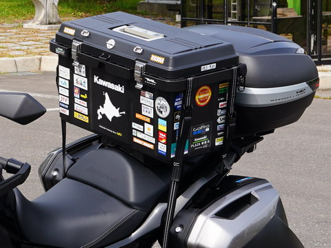 | 2008年 夏 1400GTR 15年活躍したCBR−1000Fを廃艦処分し、1400GTRを導入したがスタイルとしては全く変わっていない。第四の箱はそのまま流用したが、これを機会に再塗装した。サフェイサーを塗ったので色の乗りが良く、10年使っても剥がれていない。ステッカーを貼りカワサキ仕様に。リアシートの形状が丸く安定しないため、発泡スチロールで整形したザブトンを敷いて安定させた。ナビはメモリ式のSONY NAV−U2に変更。テント、シュラフなどに変更は無い。以前の方法で三脚が積めなくなったので積んでいない。 |