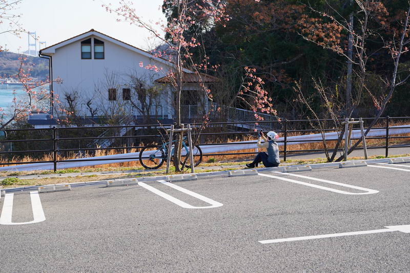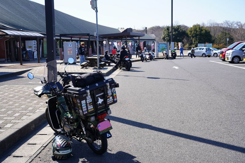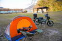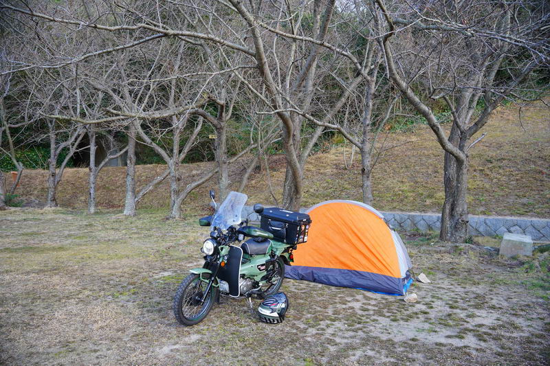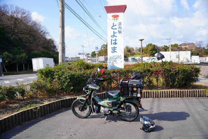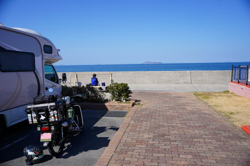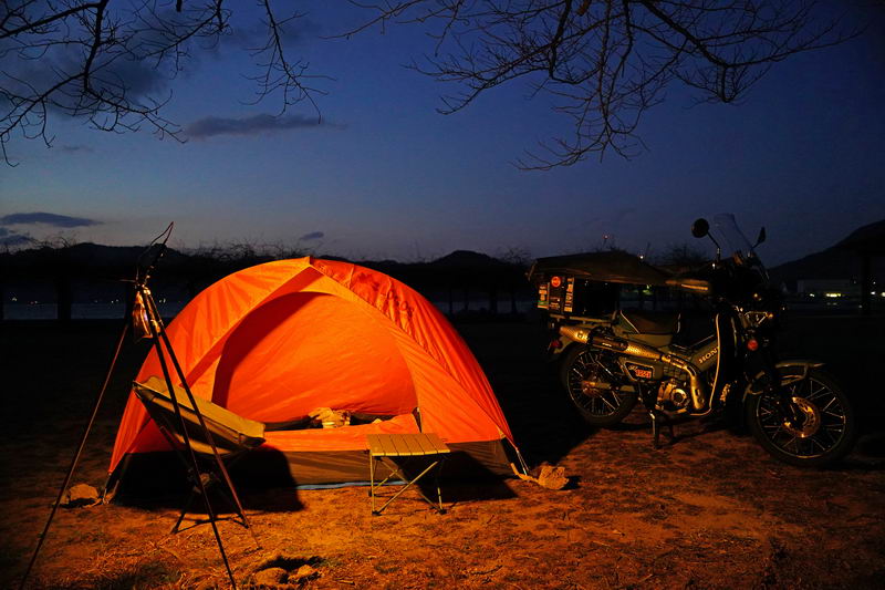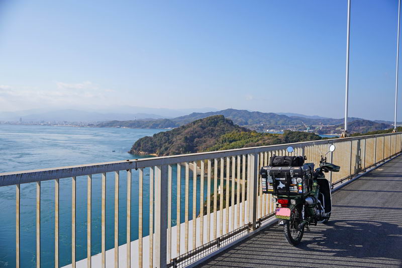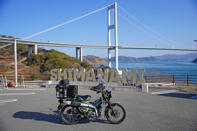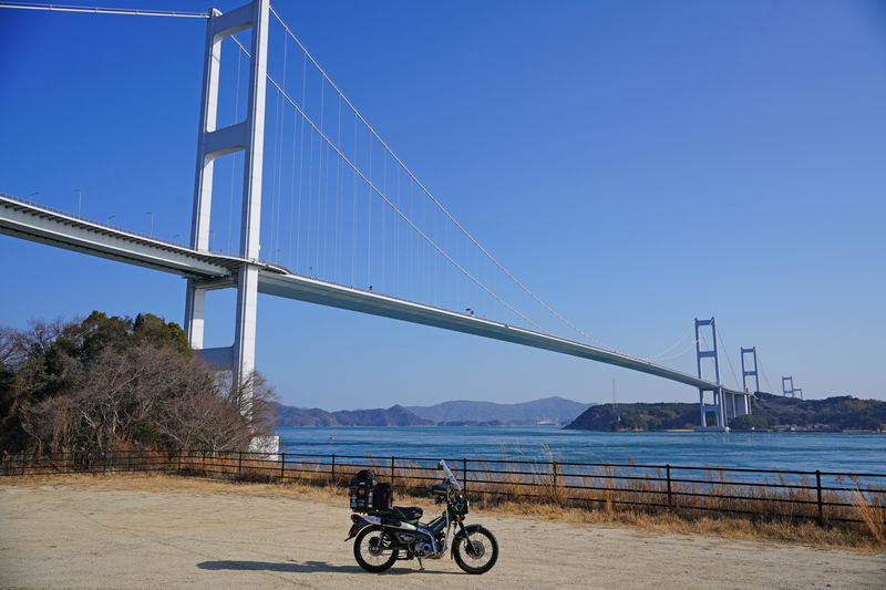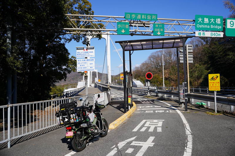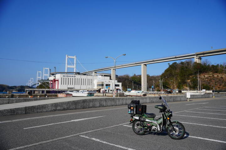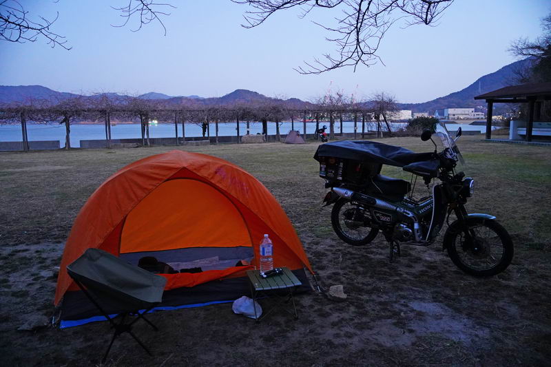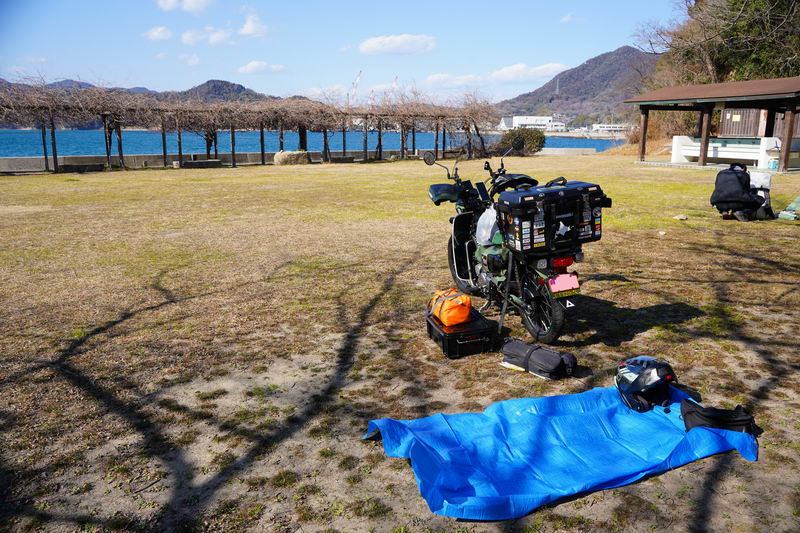 2026/02/18 晴 ついに前期高齢者になりました。まだ元気なウチにやりたいことをやっておかねば、いつ病気で死ぬかもしれないし、放っておいても寿命が来てしまいます。今年の冬キャンは、まだ1回だけです。春になったら次の冬キャンまでまた長い時間待たなくてはなりません。ココは行けるウチに行っておきたいと思いました。ネタ切れ深刻で、2013年に当時のGTRオナクラ仲間と行った、しまなみ海道の見近島に行ってみようと思いました。見近島は無人島でキャンプ場しかありません。しかも車でのアクセスが不可で、しまなみ海道の高速道路の横にある自転車や原付道の途中から降りるしかありません。歩きor自転車or50〜125ccの原付しか行けない謎の島のキャンプ場なのです。自転車や歩きだとキャンプ道具の積載に制限があるので必然的に荷物を積めるカブの比率がとても高いのも特徴です。朝、家事を急ぎ済ませて8時過ぎに出発です。 今回はキャンプ道具…しかも冬期で暖をとるのに必要なグッズが多くて大変です。USB電熱ベストのために持っているモバイルバッテリー7個を全て積んでますし、使い捨てカイロ、ハクキンカイロ(と燃料)や就寝時のジャージ(下だけ)、炭やピラミッドグリル、ガスバーナーなど多数です。積載はカブ単独で北海道ツーリングに行ったときの箱を2個積む方法をとります。さらに容量upのため、チェアとテーブルは第四の箱の上にくくりつけています。重量が増えているのでリアショックのプリロードも最大にしておきます。荷物を積むとサイドスタンドを立てた場合にバイクが傾き過ぎるのでサイドスタンドを調整して傾かないようにしておきました。カブに大荷物を積むのはマジ大変です。 天気は良いですが気温は思ったより寒くて5度くらい。風が少し強く、キャンプでは風が大敵なので心配です。まず、道の駅たからだの里で休憩。バイクは皆無でした。今回は荷物が多くてコーヒーのボトルも持ってこれませんでしたので110円の缶コーヒーを飲みます。街路樹の木々の枝を見ると枯木につぼみが見えました。春は近づいてきています。続いて道の駅とよはまでトイレ休憩。ここもバイク皆無でした。 お昼前になったので新居浜のすき家に入って昼食。嫁が車を買ったときに1年間無料でJAFに入れてもらったので届くクーポンがあり50円引きになります。毎度の牛丼とサラダ、味噌汁のランチセット600円が550円と今時では安い方かも。 四国中央市から今治まで混雑してる街中を走るしかありません。伊予西条から今治まではGoogle先生の導きで県道に入って走りますが、西条からしばらくはイイ感じで走れたのですが、それ以外はトホホな道ばかり。ペースが上がりません。途中でトイレがしたくなりガソリンスタンドで給油&トイレ。 今治のローソンにて今夜のメインである冷凍の旨辛チゲうどんを買っておきます。見近島に着いた後に隣の伯方島のローソンに行く予定ですが、在庫が無かったら即死なので先行入手です。既に積載限界を超えているので股の間にあるベトナムキャリアの上に載せて、持ってきたヒモでハンドルに固定して飛ばないようにしています。かっこ悪いけど仕方ありません。本当はココで、翌朝のパンや、カップ飯、2Lの水など買って行けばキャンプインしてから出ることもないのですが、積載限界を超えているのでそれは無理(´Д`) しまなみ海道の原付入口から入って橋を渡ります。入口付近では、白人系の家族の自転車ご一行様がいました。この日は外国人はアジア系はみかけなくて白人系が多かったかも。アジアでは自転車は生活の運搬的乗り物で、ヨーロッパではスポーツや趣味としての自転車文化があるからかもしれませんね。 橋を渡ります。高速道路は途中の島に降りることなく広島県に行けますが、原付や自転車道は海にかかる橋の部分だけ渡ることができ、島に入ると降ろされてしまうのです。今日は天気が良いので景色も最高です(^^)/ 来て良かったと思える瞬間ですね。高速道路では停車することができませんが、自転車や原付は止まり放題でゆっくり景色を楽しめます。橋は少し高い位置にあるので景色が良く見えていいですね。 橋の途中、馬島のところに料金所があります。ココで馬島に降りることも可能です。以前は自転車も有料でしたが今は無料化されています。が、原付はあいかわらず有料で馬島まで100円、大島まで行くと200円必要です。カブ乗りである某S氏は、入れたフリだけしておけばイイじゃん…とブッチするようですが、ソレはいけません。ちゃんと支払っておきます。 大島に降りて島内の一般道を走ります。島の南側から北側まで次の来島海峡第二大橋まで走るのですが、サイクリングしている人も多数みかけました。海岸沿いを走るところは天気も良く景色がとても良かったです。海流の流れが速いのが見てわかるくらいの海でした。 次の来島海峡第二大橋に入り、途中にある料金所を通過しますが、ココは50円です。なぜか